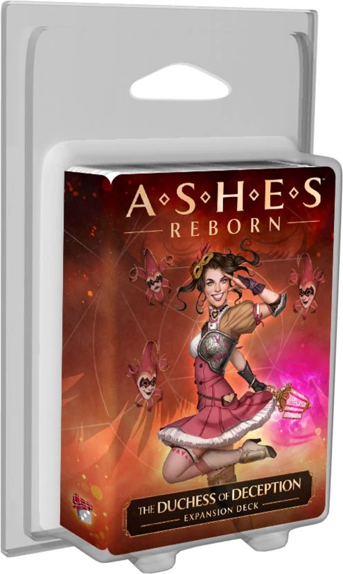 The Duchess of Deception deck, Featuring new Phoenixborn Victoria Glassfire, is a full, ready-to-play Ashes expansion deck including 2 conjurations.