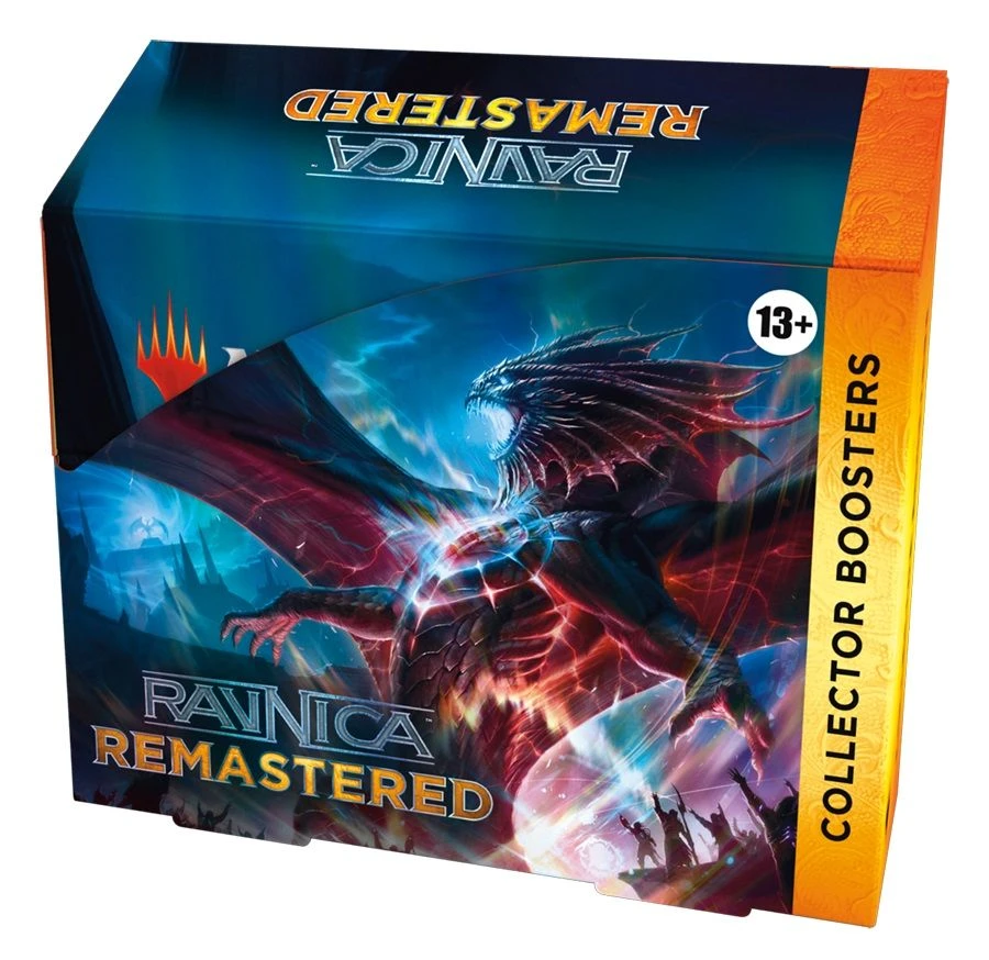 This Ravnica Remastered Collector Booster Box contains 12 Ravnica Remastered Collector Boosters. Each Collector Booster contains 15 Magic: The Gathering cards and 1 Traditional Foil double-sided token, with a combination of 4–5 cards of rarity Rare or higher, 3–7 Uncommon, and 4–8 Common cards. Every pack contains a total of 11 Traditional Foil cards.