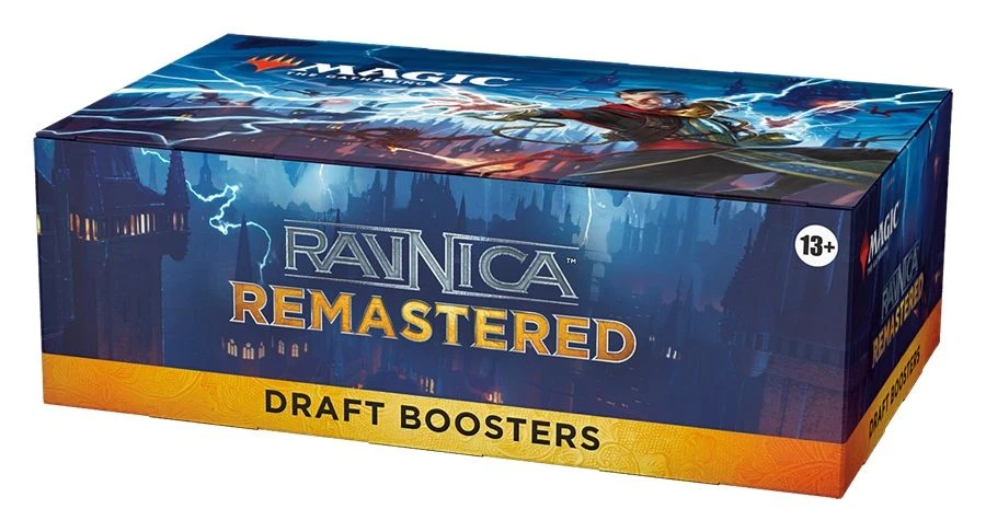 This Ravnica Remastered Draft Booster Box contains 36 Ravnica Remastered Draft Boosters. Each Draft Booster contains 15 cards and 1 token/ad card, including 1–2 cards of rarity Rare or higher, 3–5 Uncommon, and 9–11 Common cards. One card of any rarity is Retro. A Traditional Foil card of any rarity replaces a Common in 33% of boosters. Traditional Foil Borderless Mythic in <1% of boosters.