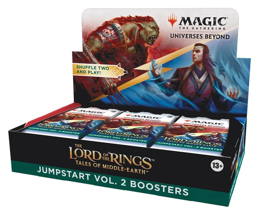 The Lord of the Rings: Tales of Middle-earth Jumpstart Vol. 2 Booster Box contains 18 The Lord of the Rings: Tales of Middle-earth Jumpstart Vol. 2 Boosters. Each booster has a theme. Just grab two packs and shuffle them together for wild combos and a unique gameplay experience that’s great for a quick game, for long-time fans looking to jump back in, or for a fun way to learn to play. Each The Lord of the Rings: Tales of Middle-earth Jumpstart Vol. 2 Booster contain 20 Magic cards (including all the lands you need to play). In every pack, you’ll find 2 Rare cards (1 Rare card designed for Jumpstart boosters and 1 Rare or Mythic Rare from the main set), and 2 Land cards with a shining Traditional Foil treatment. This product does not contain Serialized Ring cards, including the Serialized Elven, Dwarven, or Human Sol Ring cards, and The 1 of 1 Ring (Serialized 001 of 001). Serialized Elven, Dwarven, and Human Sol Ring cards can only be found in some The Lord of the Rings: Tales of Middle-earth Collector Boosters. Only one card has been printed of The One Ring (Serialized 001 of 001), and this card can only be found in one English-Language Collector Booster. Non-serialized Ring cards are mechanically identical to their Serialized versions. If you’re looking to maximize your mashups, The Lord of the Rings: Tales of Middle-earth Jumpstart Vol. 2 Boosters can be combined with packs from any other Jumpstart product.